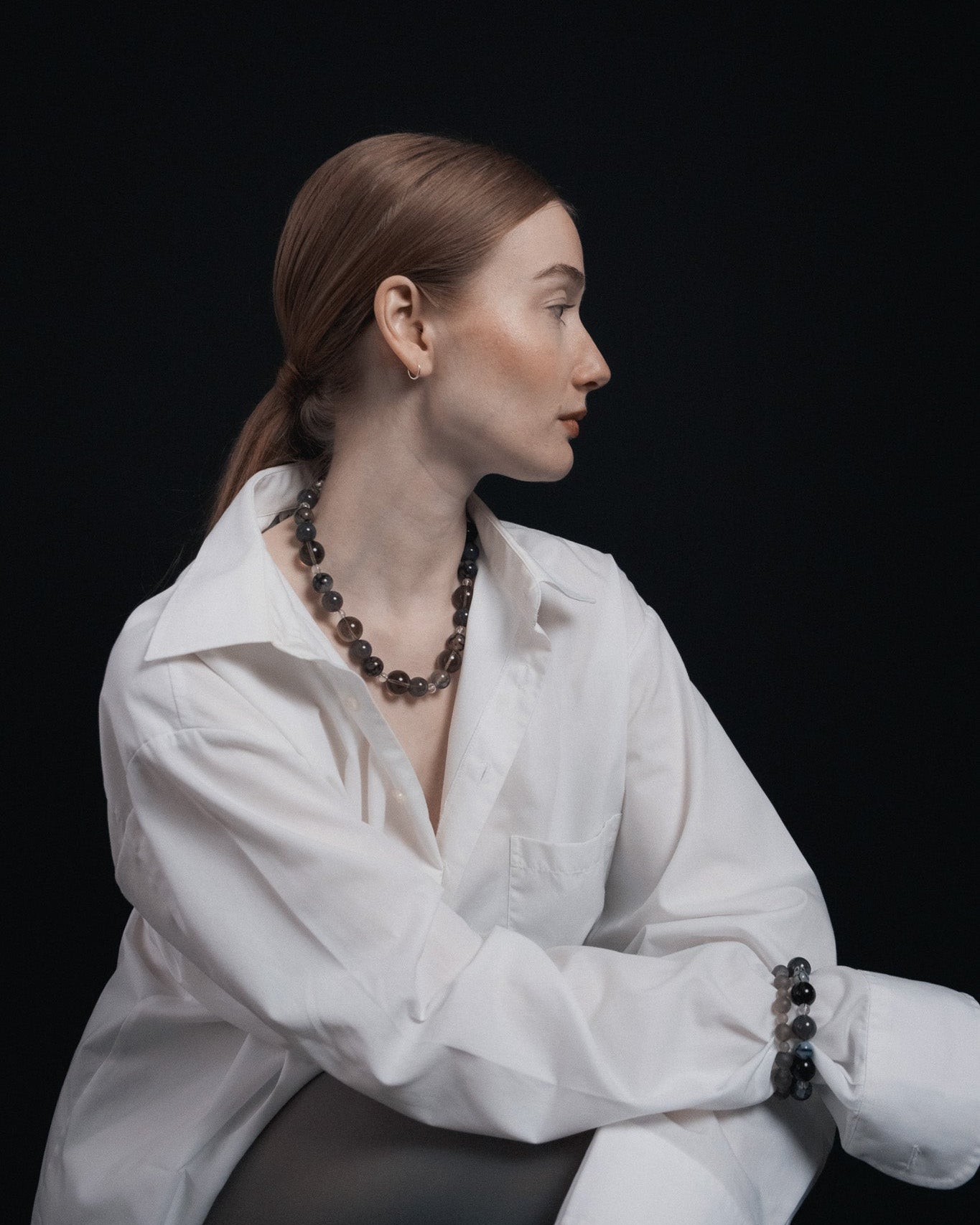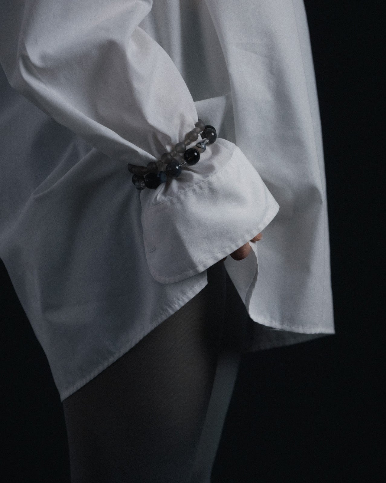 Voilée brings together the full language of the fragment — veiled greys, soft smoke, and muted lavender stones composed in a quiet, shifting rhythm. Each bead reveals a different texture of light, forming a layered silhouette that rests naturally against the body. Finished with a 925 sterling silver magnetic clasp.