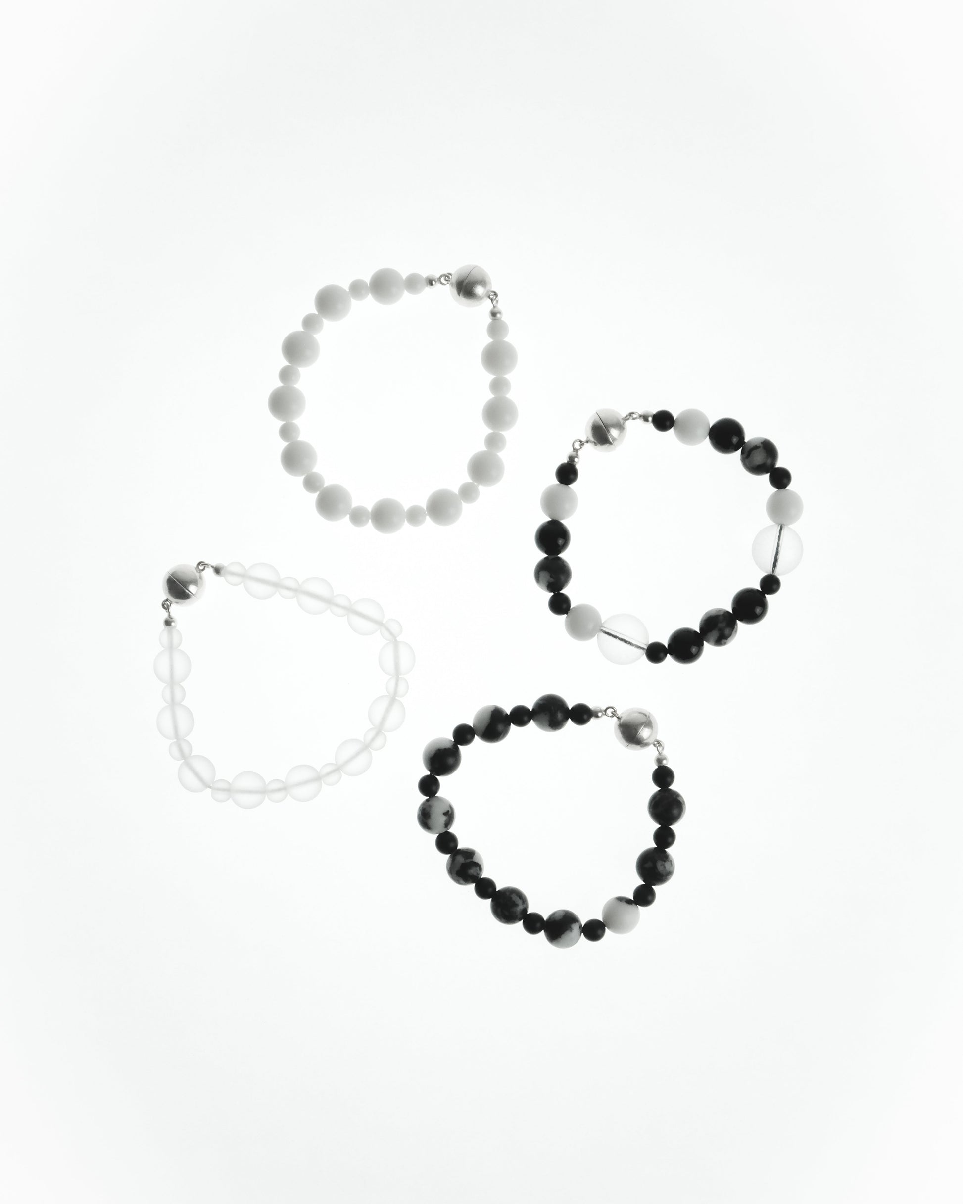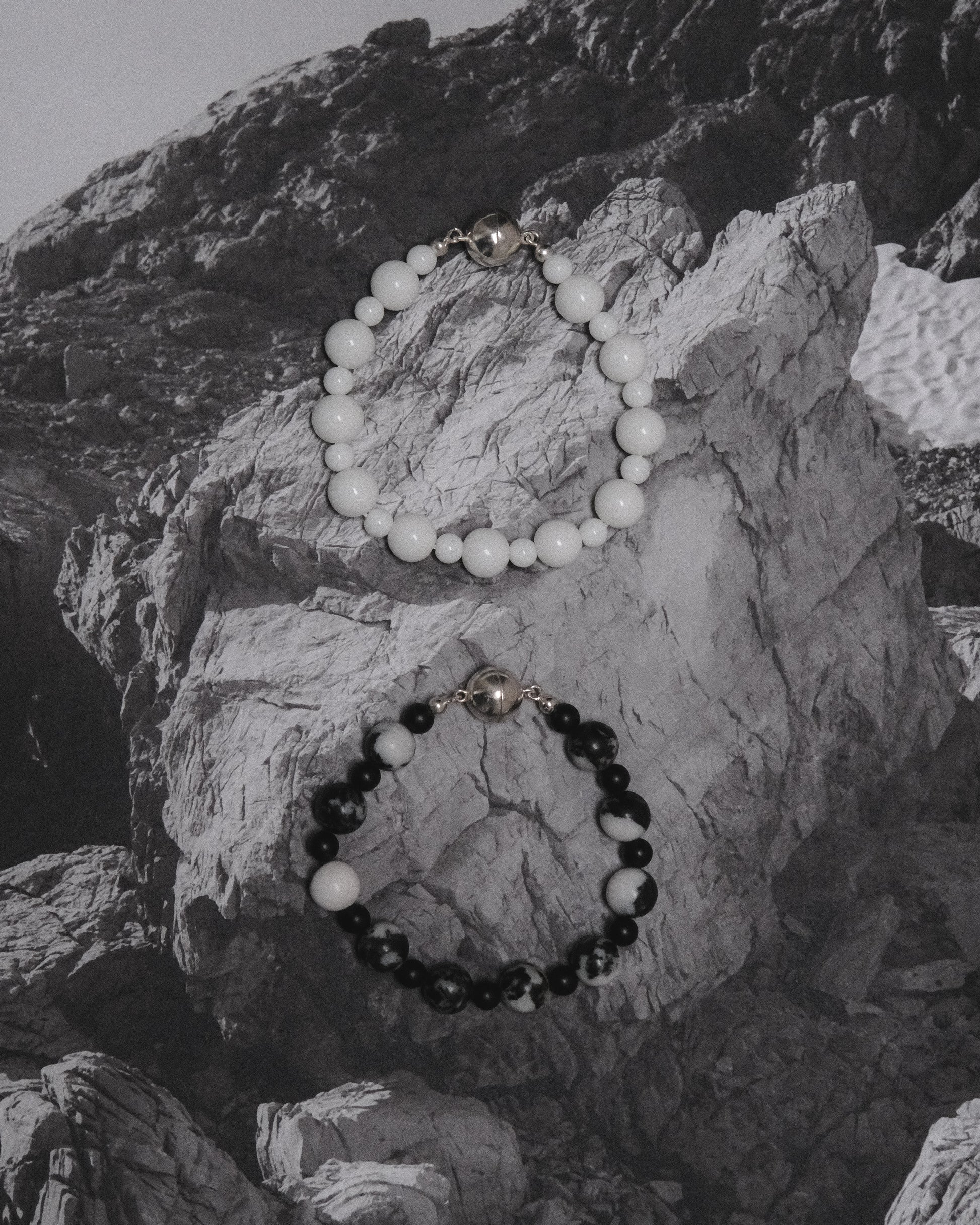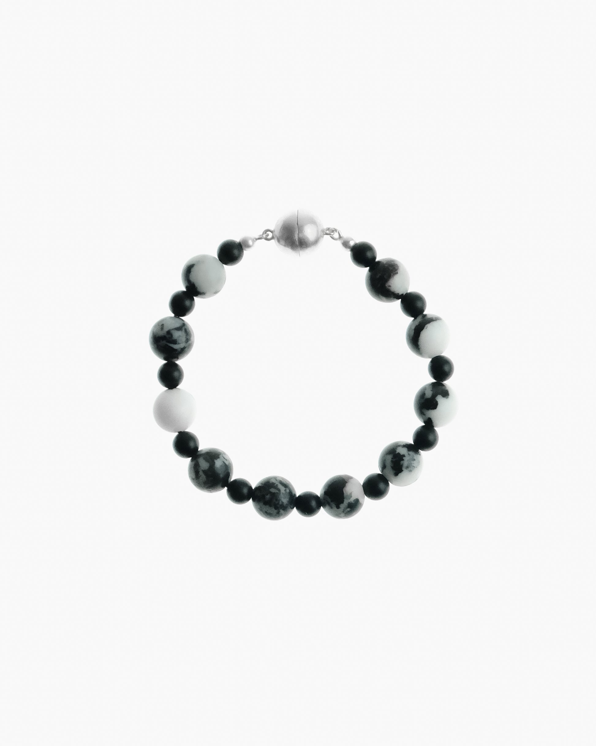 A tide of ink and mineral. Encre moves in muted rhythm, sculpted from gemstones that swirl like storm clouds folding into seafoam. Elemental and raw, it holds the strange beauty of still waters stirred by shadow. Finished with a 925 sterling silver magnetic clasp.