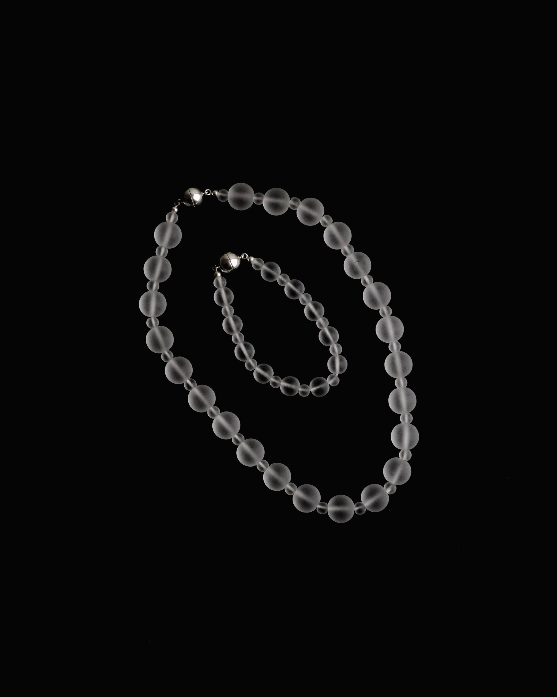 Sculpted from veiled quartz, Méduse evokes the pale translucence of the moon jellyfish — fluid, weightless, quietly elemental. Its surface catches the light like sea-glass; luminous and alive with the hush of the deep. Finished with a 925 sterling silver magnetic clasp.