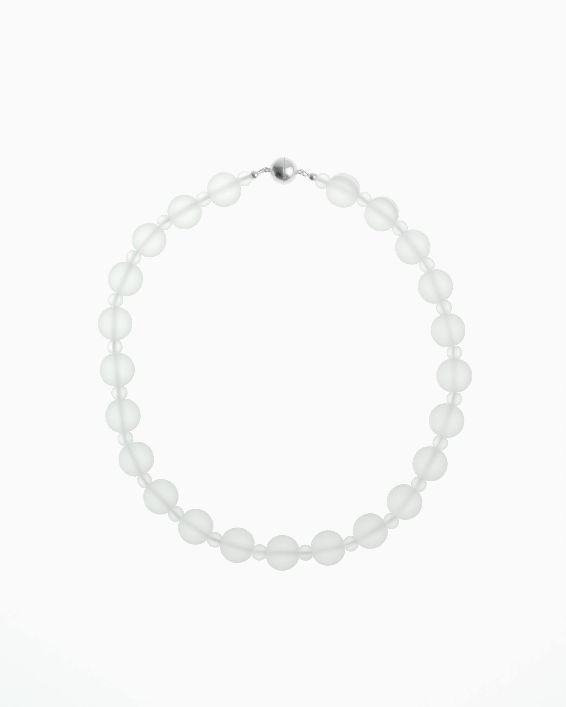 Sculpted from veiled quartz, Méduse evokes the pale translucence of the moon jellyfish — fluid, weightless, quietly elemental. Its surface catches the light like sea-glass; luminous and alive with the hush of the deep. Finished with a 925 sterling silver magnetic clasp.